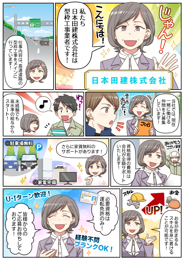 | 採用職種 | 高速道路の型枠工事の現場作業に携わっていただきます。 |