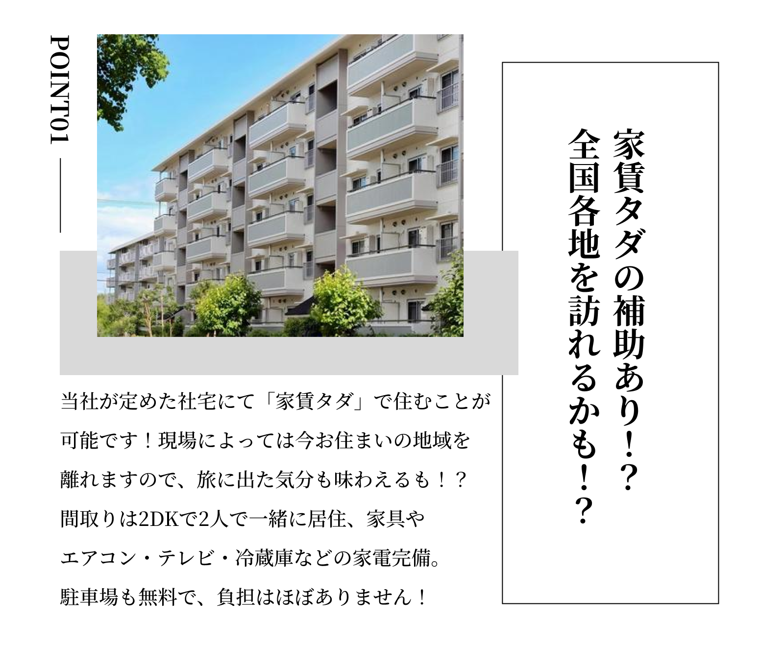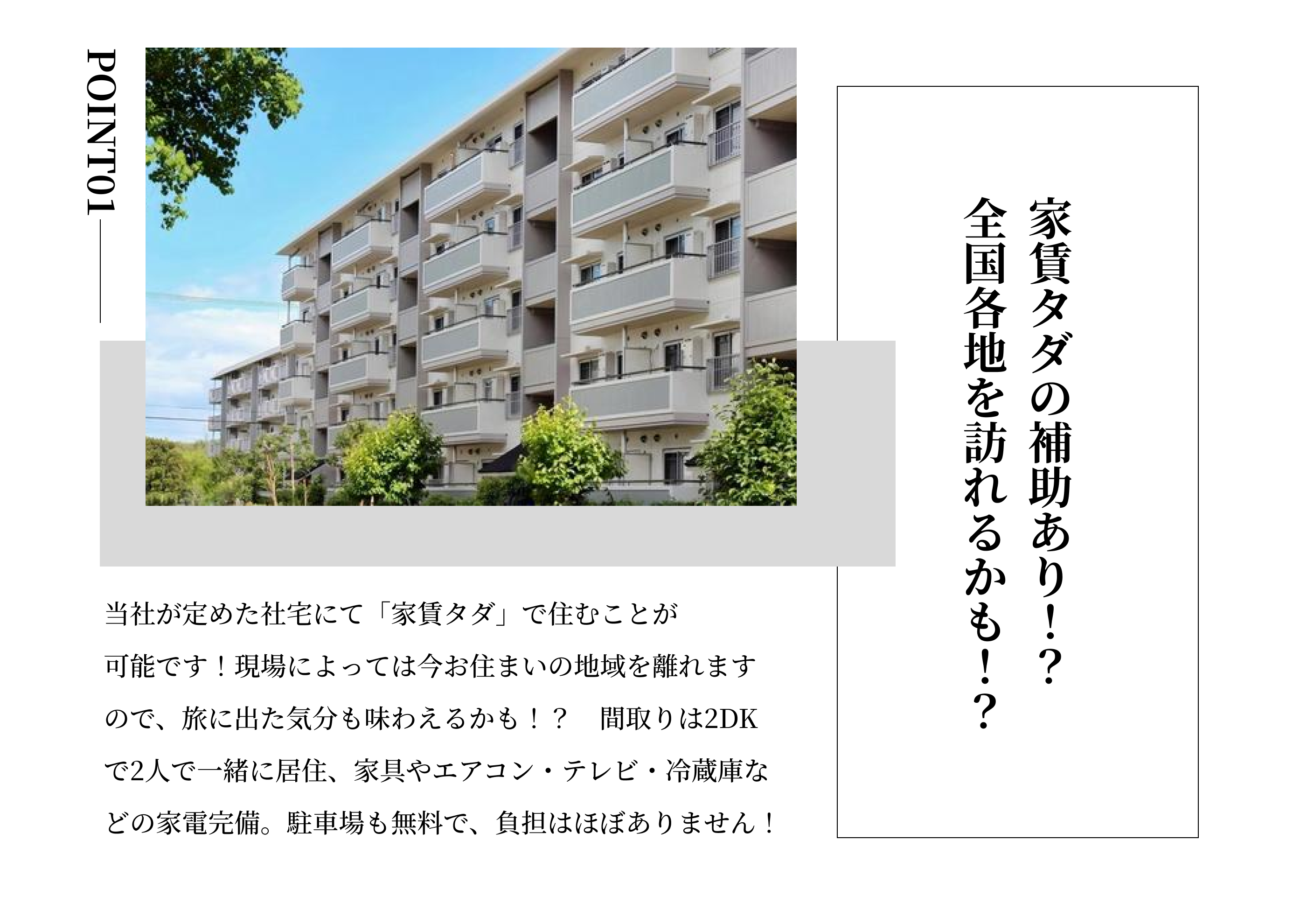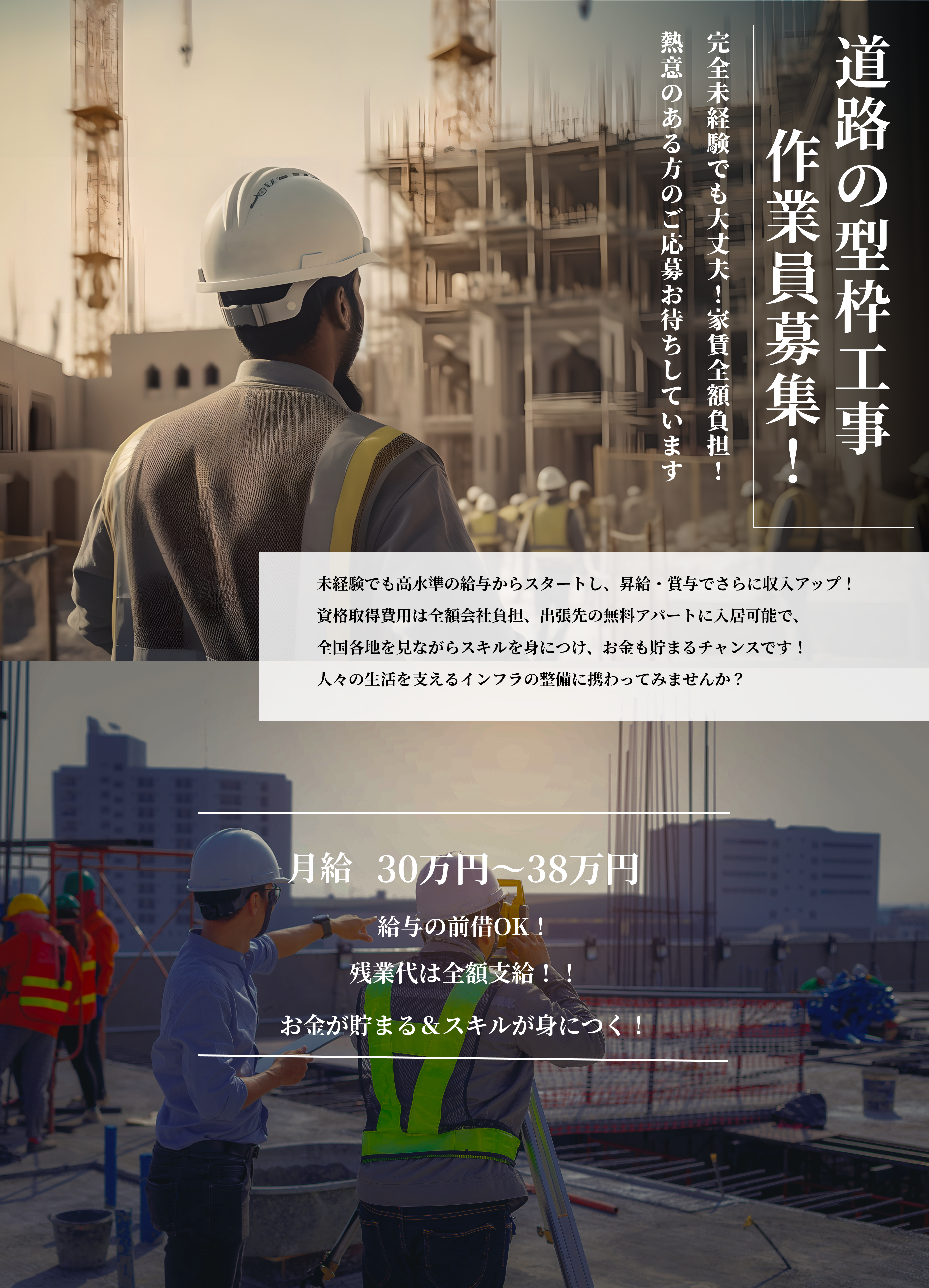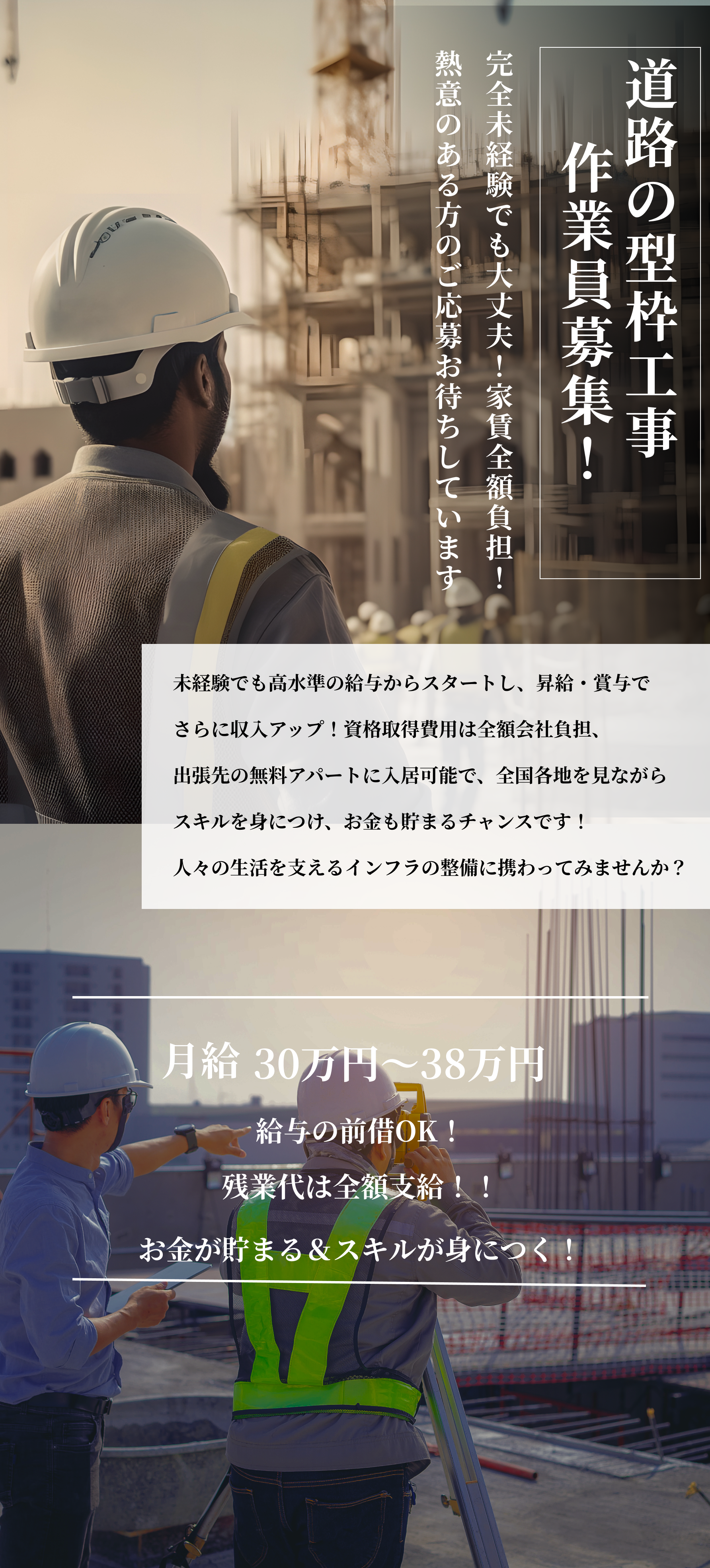<必須> ・普通自動車免許(AT限定可) <経験者歓迎&ブランク歓迎> ・玉掛け作業者 ・型枠支保工の組立て等作業主任者 ・型枠施工技能士 ・フルハーネス資格 <POINT> ・未経験者歓迎!経験不問 ・経験者も歓迎!ブランクOK ・U・Iターン歓迎 |