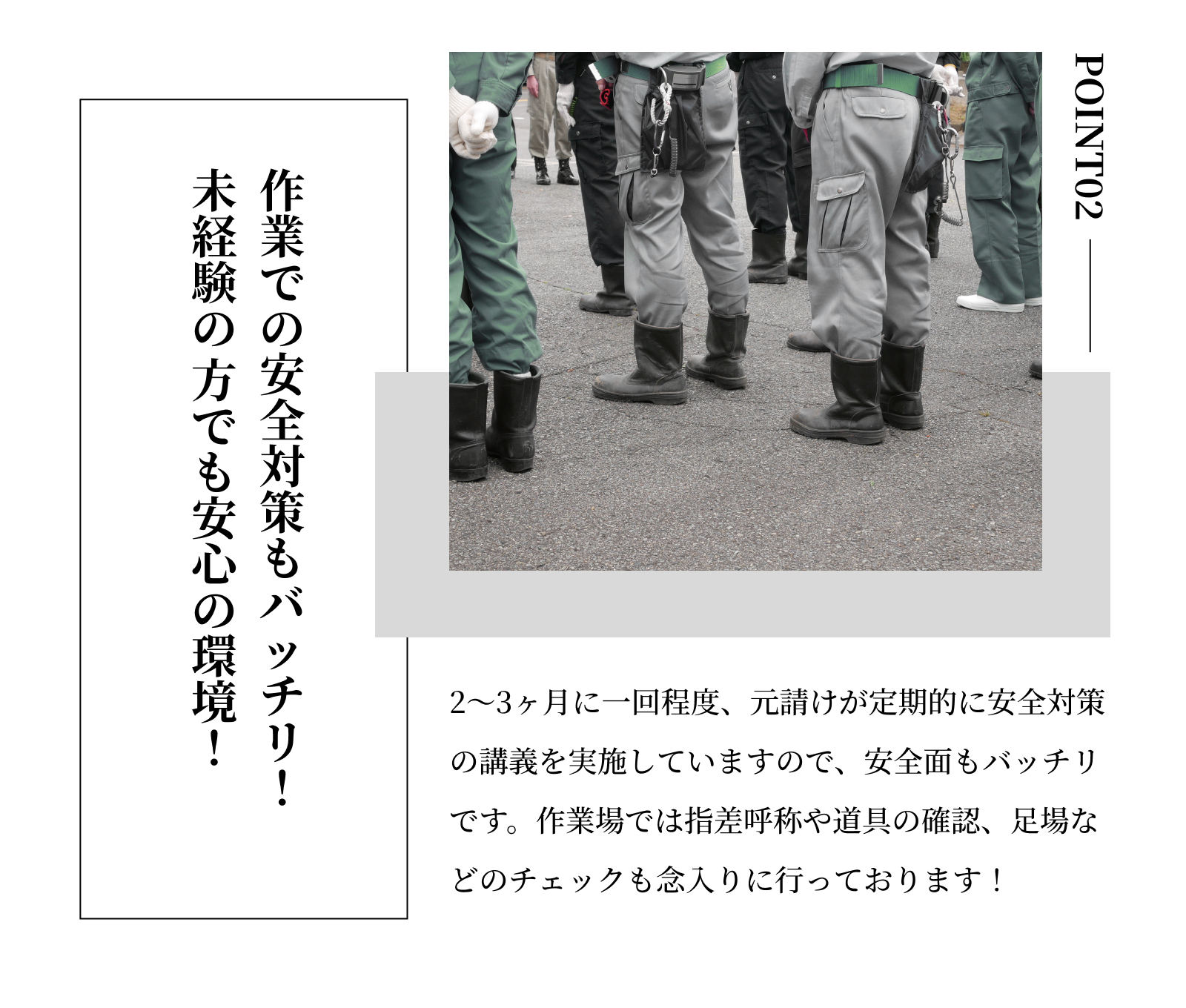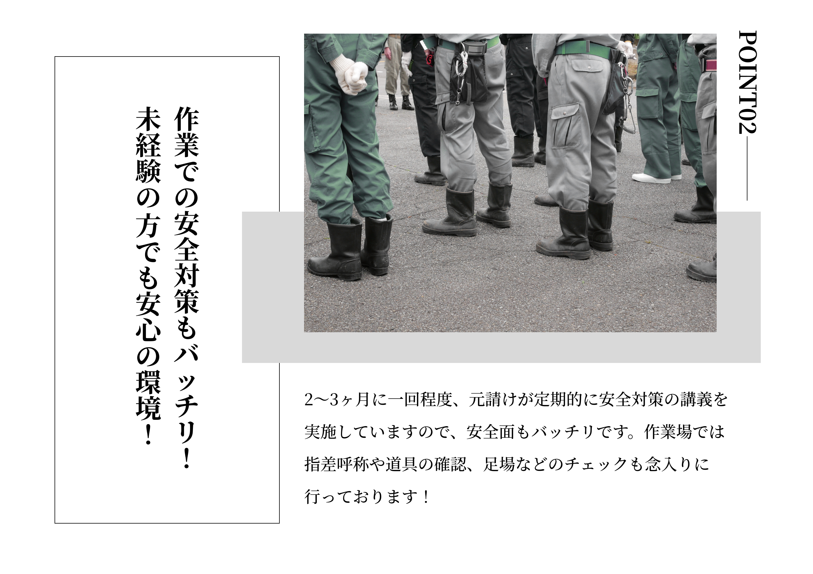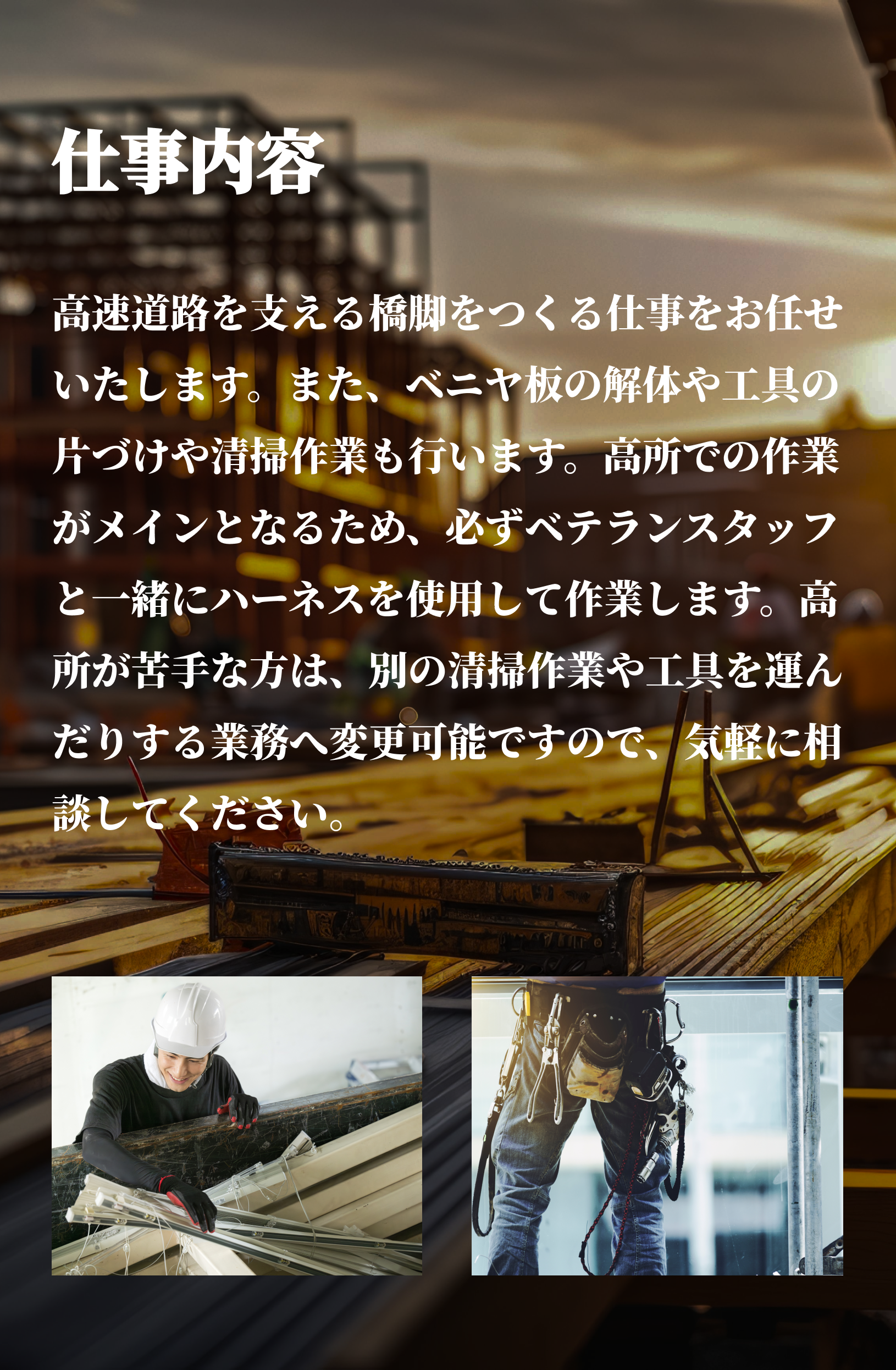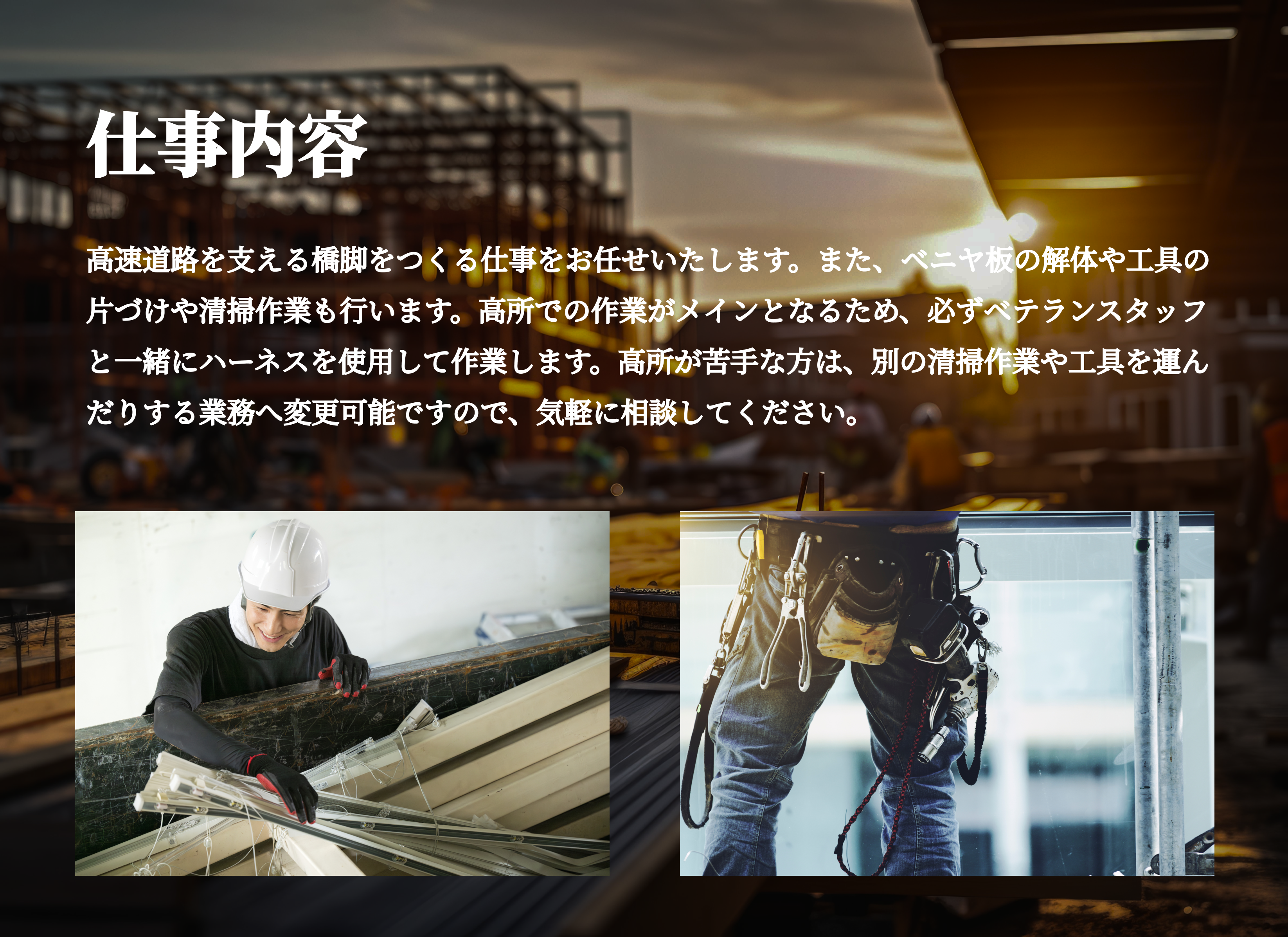 | 採用職種 | 高速道路の型枠工事の現場作業に携わっていただきます。 |